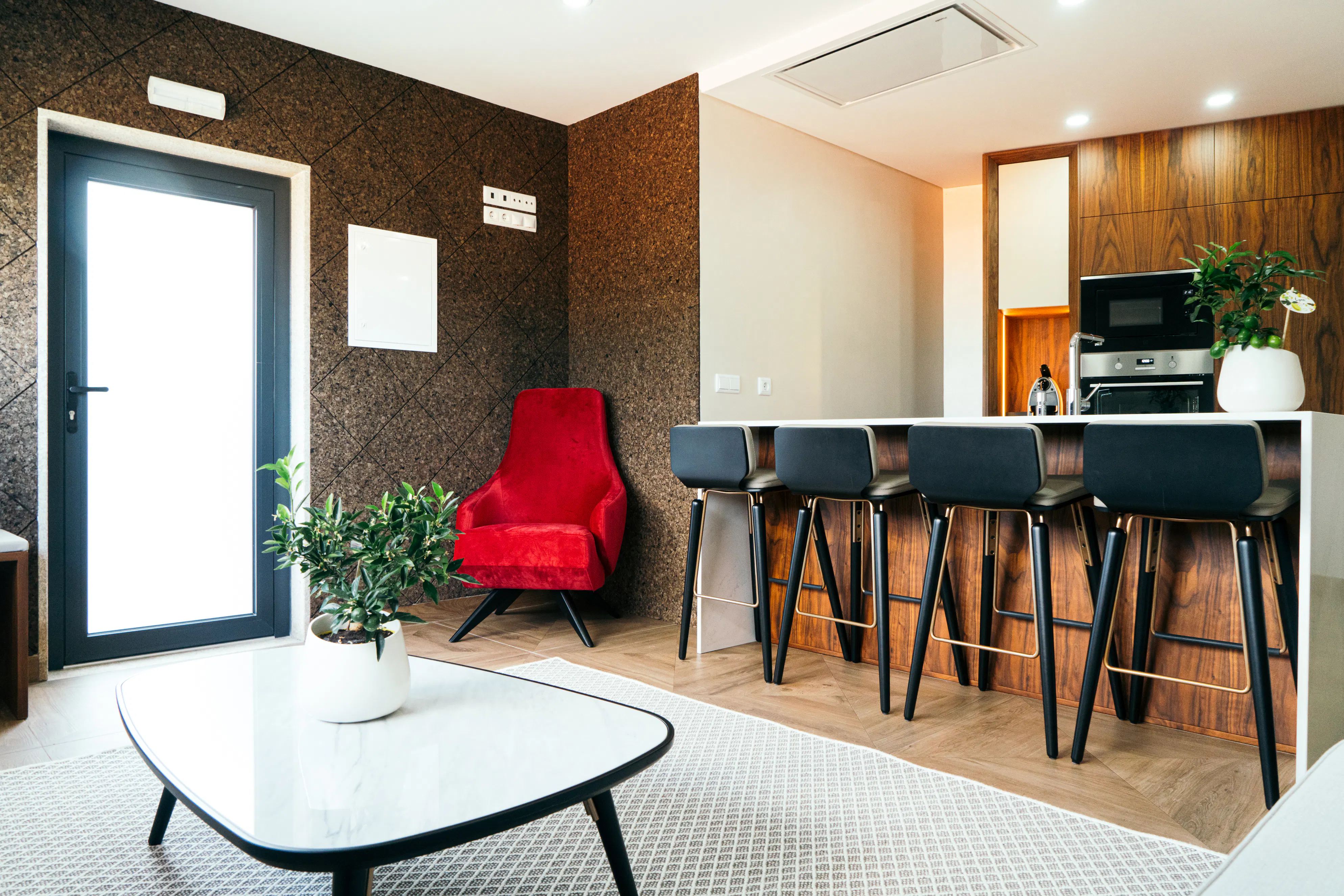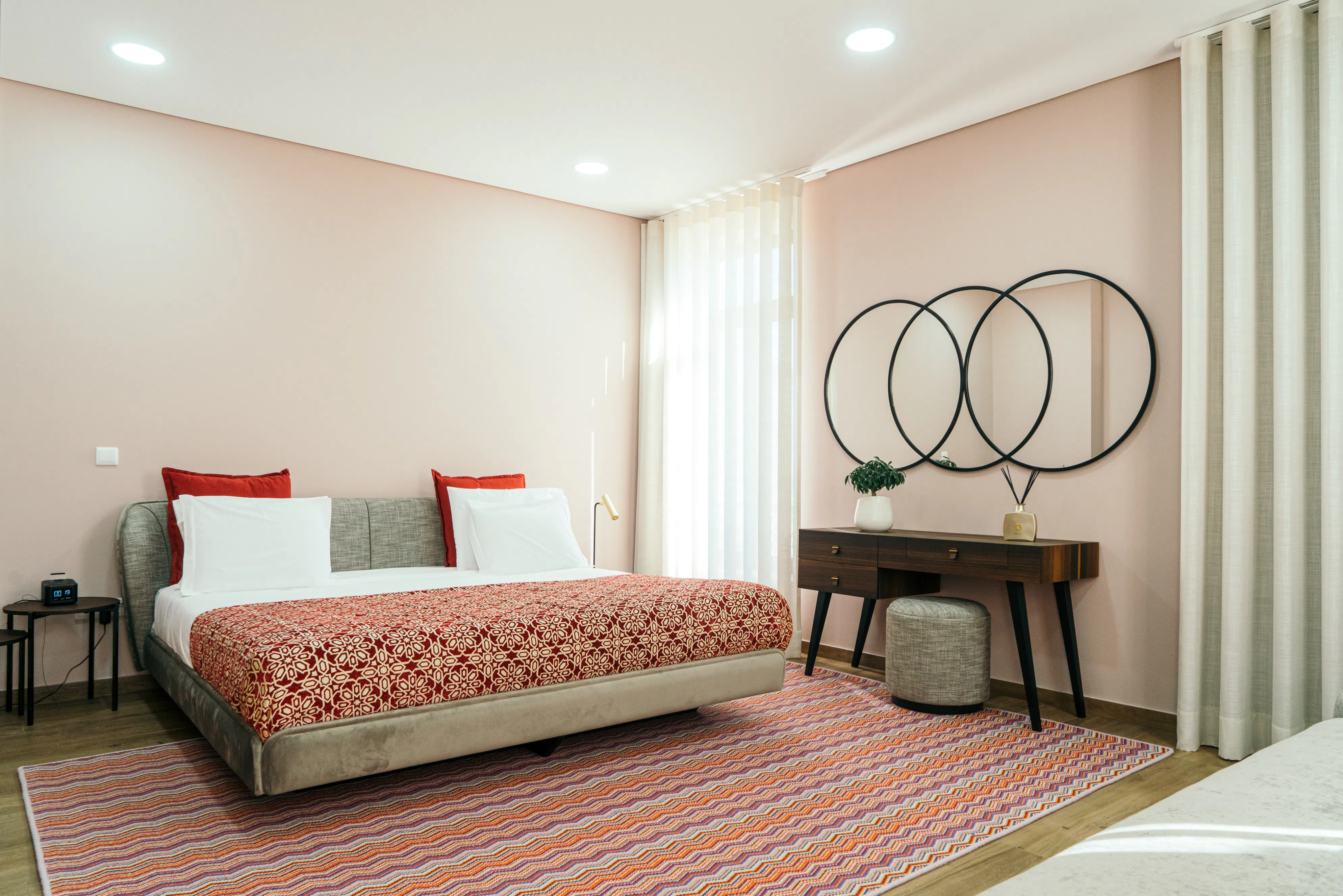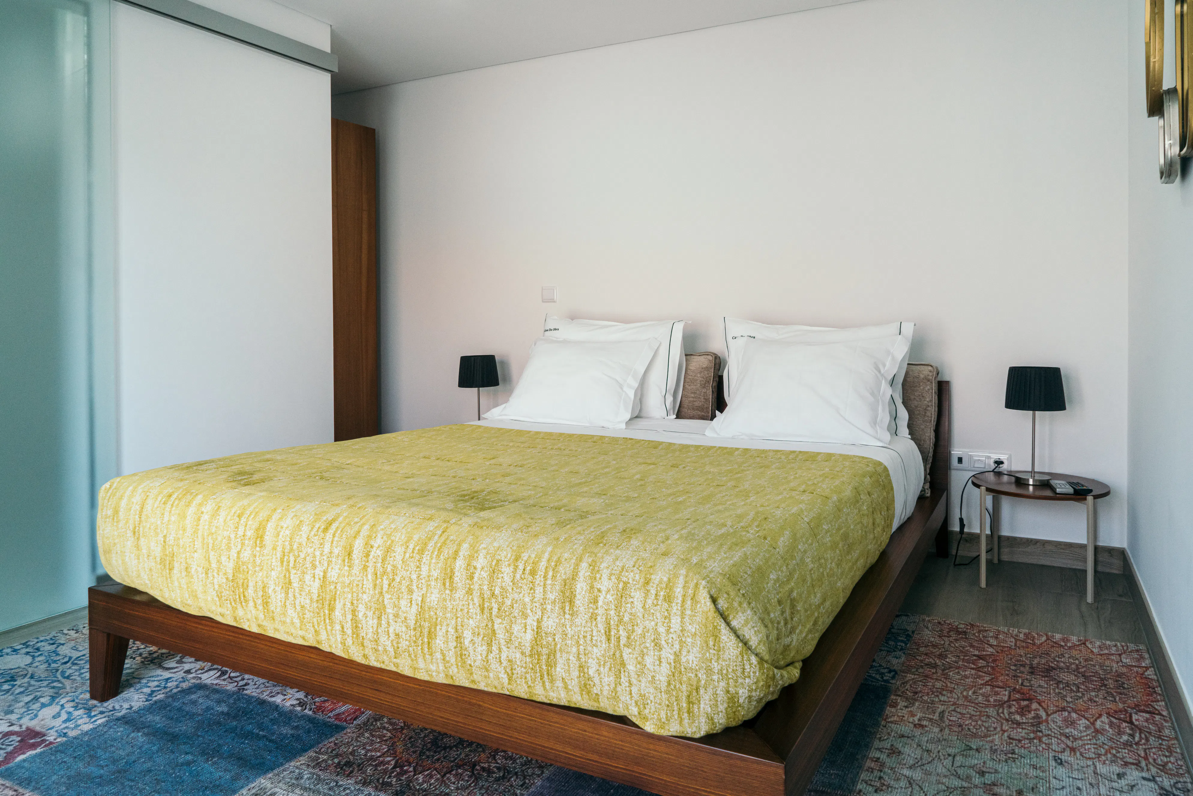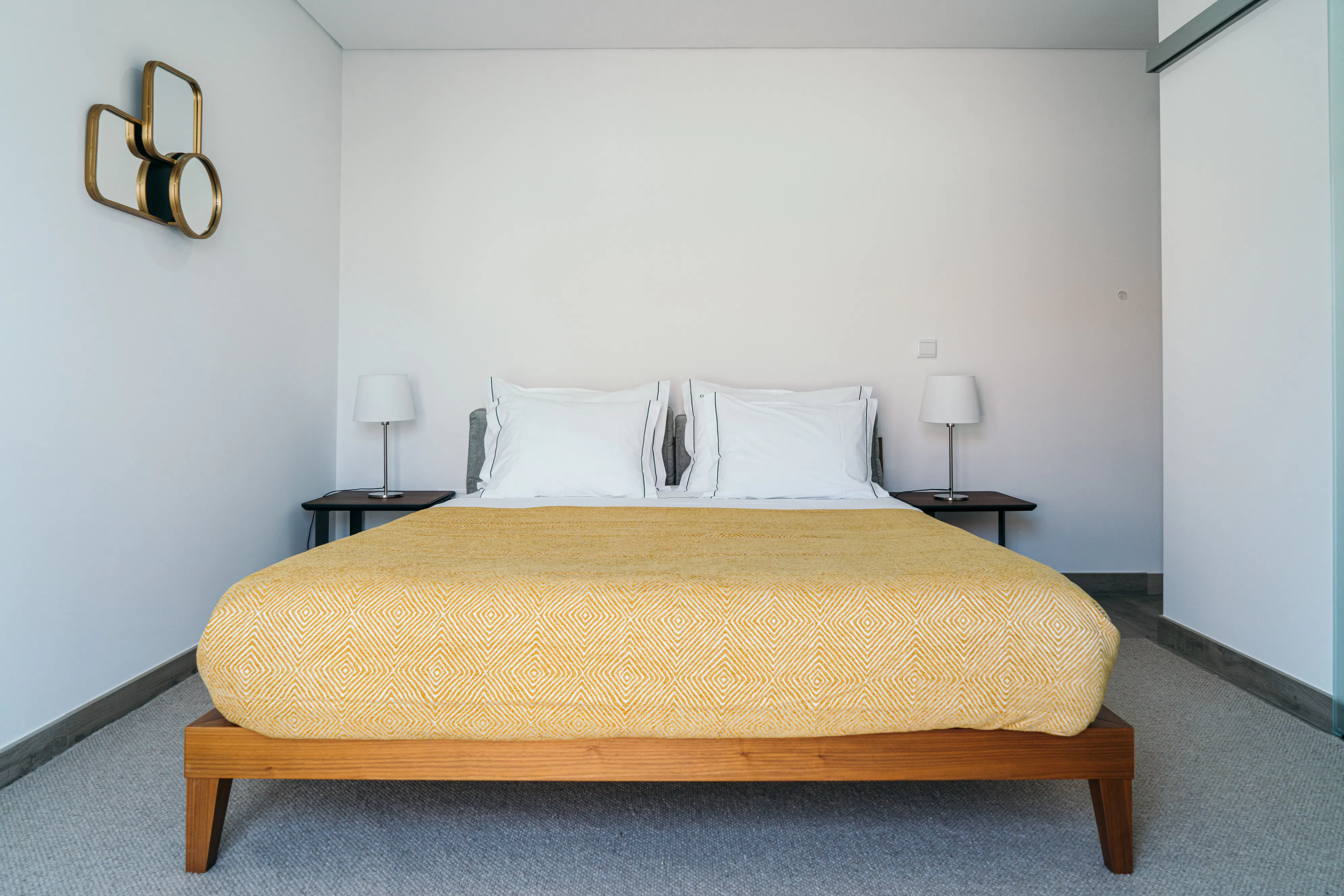 A estrutura original do edifício está presente na configuração atual de cada quarto, onde as paredes exteriores ainda permanecem em granito azul, tão típico da região. Na leveza de uma decoração simples e puro conforto.